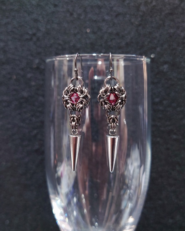 エレガントなゴシックデザインで人気のエニグマメイルにハードなスパイクチャームを合わせました。 丸カンカラー:ロジウムシルバー ピアスフック:真鍮 ロジウムメッキ ビーズ:スワロフスキークリスタル カラー:スカーレット(赤) サイズ:縦約4cm、横約1.7cm アレルギー対応のピアスフック(チタン)、ポスト(チタン)への変更、イヤリング金具への変更を無料で行っています。 御希望の方は備考欄へご記入下さい。 お店では色々な種類のチェーンメイルアクセサリーを製作、販売しています。 オーダーメイドやカスタムも行っていますので是非お店にご来店、遊びに来て下さい! チェーンメイルアクセサリー Nocturnal 奈良市南市町4 植畑ビル2階 10時30分~19時 定休日 月曜日(祝日は営業) ☎️080-1408-1167 購入の際の注意点 *チェーンの部分が、ニットなどに引っかかる場合があります、お取り扱いにはご注意下さい。 *1つ1つ手作りで繊細な作りになっております。お取り扱いにはご注意下さい。 *金属アレルギー、メッキ加工が肌に合わない方はご注文をお控え下さい。 *ご覧頂いている環境・モニターにより、画像と実物の色が多少異なって見える場合があります。ご了承下さい。