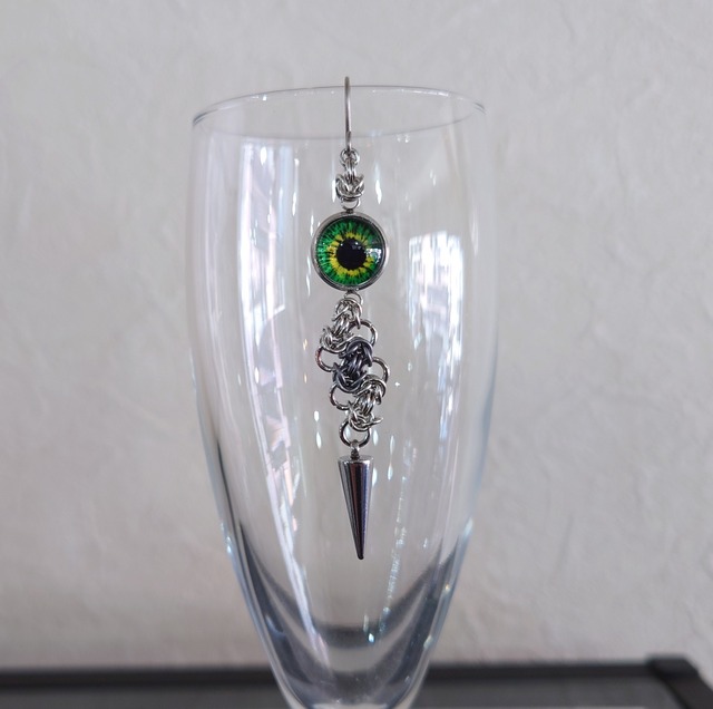 ※こちらは一個売り(片耳用)になります。 ビザンチンメイル3連にカラフルな目玉とスパイクチャームを合わせた、少しホラーでゴシック&パンクなデザインです。 丸カンカラー:ロジウムシルバー×アンティークシルバー 目玉のカラー:グリーン ピアスフック:チタン(金属アレルギー対応) サイズ:長さ約6cm お店では色々な種類のチェーンメイルアクセサリーを製作、販売しています。 オーダーメイドやカスタムも行っていますので是非お店にご来店、遊びに来て下さい! チェーンメイルアクセサリー Nocturnal 奈良市南市町4 植畑ビル2階 10時30分~19時 定休日 月曜日(祝日は営業) ☎️080-1408-1167 購入の際の注意点 *チェーンの部分が、ニットなどに引っかかる場合があります、お取り扱いにはご注意下さい。 *1つ1つ手作りで繊細な作りになっております。お取り扱いにはご注意下さい。 *金属アレルギー、メッキ加工が肌に合わない方はご注文をお控え下さい。 *ご覧頂いている環境・モニターにより、画像と実物の色が多少異なって見える場合があります。ご了承下さい。