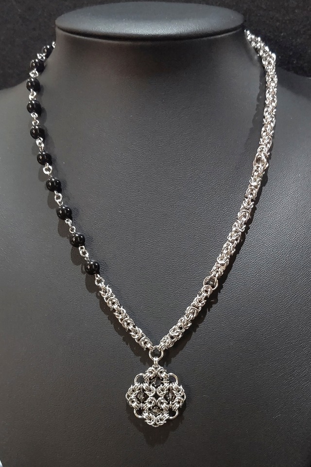 トップにフォーエニグマメイルのペンダントトップ。 ネックレス部分は片側をビザンチンメイルにスワロフスキークリスタルを閉じ込めたサイバーメイル、もう片側はビザンチンメイルを少しとスワロフスキークリスタルパールで製作したアシンメトリーデザインです! スタイリッシュでエレガントなデザインに仕上げました。 ゴシックスタイルやロックスタイルにも良く合います。 丸カン:ロジウムシルバー ビーズ トップ部分 スワロフスキークリスタル カラー:シルバーナイト ネック部分 スワロフスキークリスタルパール カラー:ミスティックブラック スワロフスキークリスタル カラー:ジェットブラック サイズ:約43cm+アジャスター約5cm トップサイズ:約2.5cm ※サイズ調整ご希望の方はご注文の際に、備考欄にサイズを記入して下さい。 購入の際の注意点 *チェーンの部分が、ニットなどに引っかかる場合があります、お取り扱いにはご注意下さい。 *1つ1つ手作りで繊細な作りになっております。お取り扱いにはご注意下さい。 *金属アレルギー、メッキ加工が肌に合わない方はご注文をお控え下さい。 *ご覧頂いている環境・モニターにより、画像と実物の色が多少異なって見える場合があります。ご了承下さい