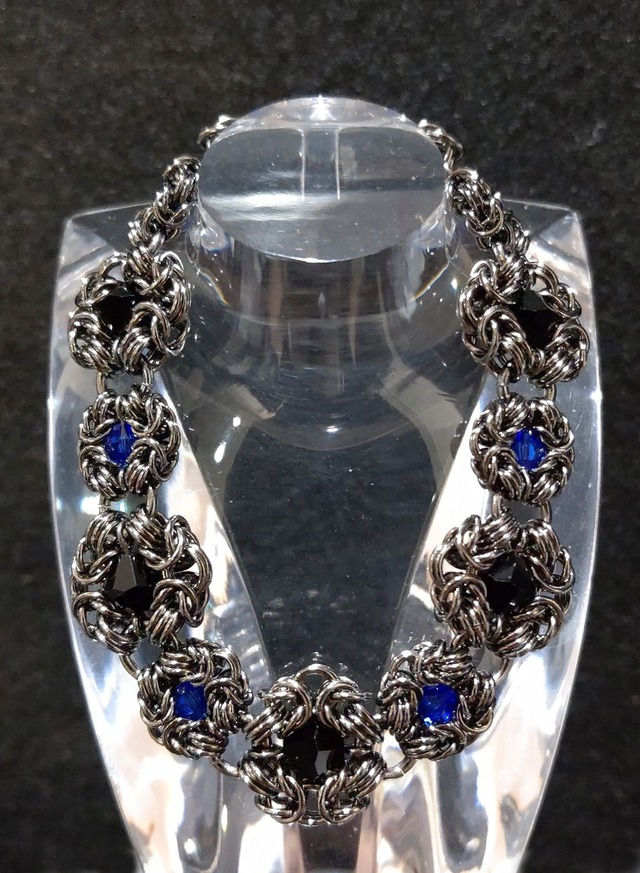 NOCTURNALを代表するデザインのブレスレットです! ゴシックでエレガントなデザインで店頭でも人気のデザインです! 丸カンカラーがダークなブラック(ガンメタ)でシルバーよりゴシックでエレガントな印象があります。 留め具は着け外ししやすい、ボタンタイプを使用しています。 使用素材 ★ビーズ:スワロフスキークリスタル チェコプレシオサクリスタル カラー:ジェットブラック、マジェスティックブルー ★丸カン:ブラック(ガンメタ) サイズ:長さ 約18.5cm(サイズ調整可能) ※サイズ調整ご希望の方はご注文の際に、備考欄にサイズを記入して下さい。 購入の際の注意点 *チェーンの部分が、ニットなどに引っかかる場合があります、お取り扱いにはご注意下さい。 *1つ1つ手作りで繊細な作りになっております。お取り扱いにはご注意下さい。 *金属アレルギー、メッキ加工が肌に合わない方はご注文をお控え下さい。 *ご覧頂いている環境・モニターにより、画像と実物の色が多少異なって見える場合があります。ご了承下さい。