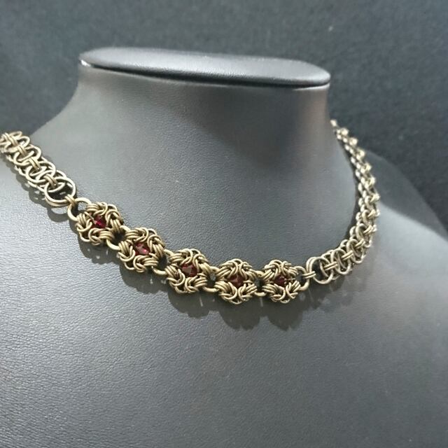 ビーズはスワロフスキーのシャム(赤色)で丸カンはアンティークゴールドを使いました。エレガントでゴシックな色合いです。