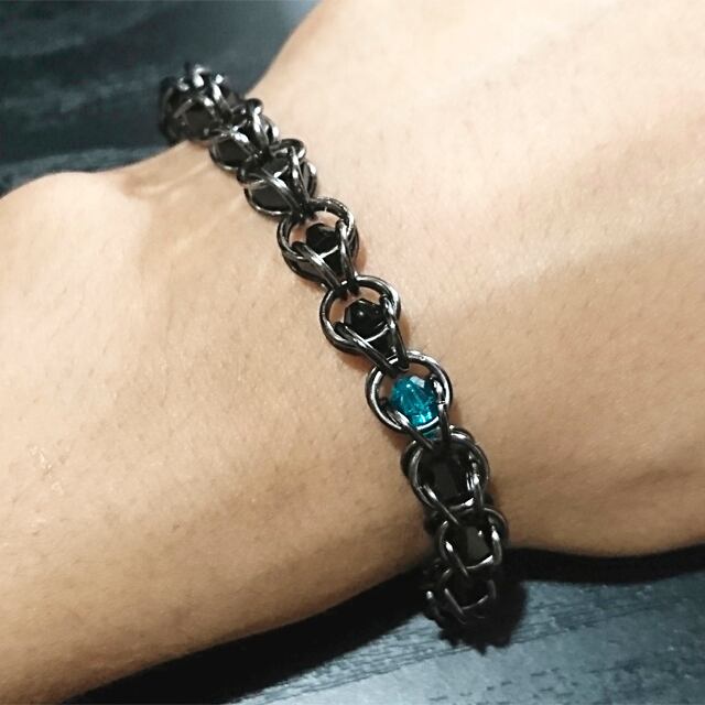 丸カンの中に、プレシオサ社チェコクリスタルビーズを封じ込めた人気のチェーンメイル・ブレスレットです。