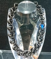 プレシオサビーズ、丸カン、金具を黒で統一して1粒だけカラービーズを入れたゴシックな色使いです。