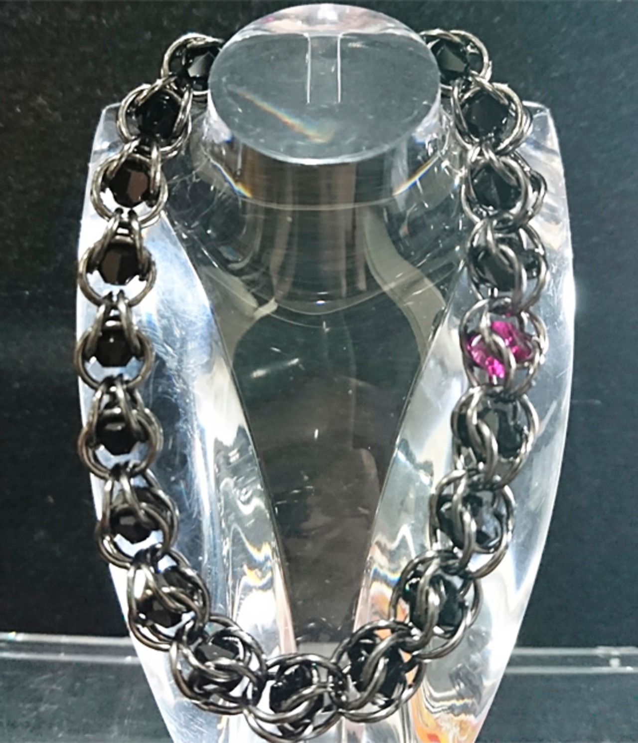 丸カンの中に、プレシオサ社チェコクリスタルビーズを封じ込めた人気のチェーンメイル・ブレスレットです。