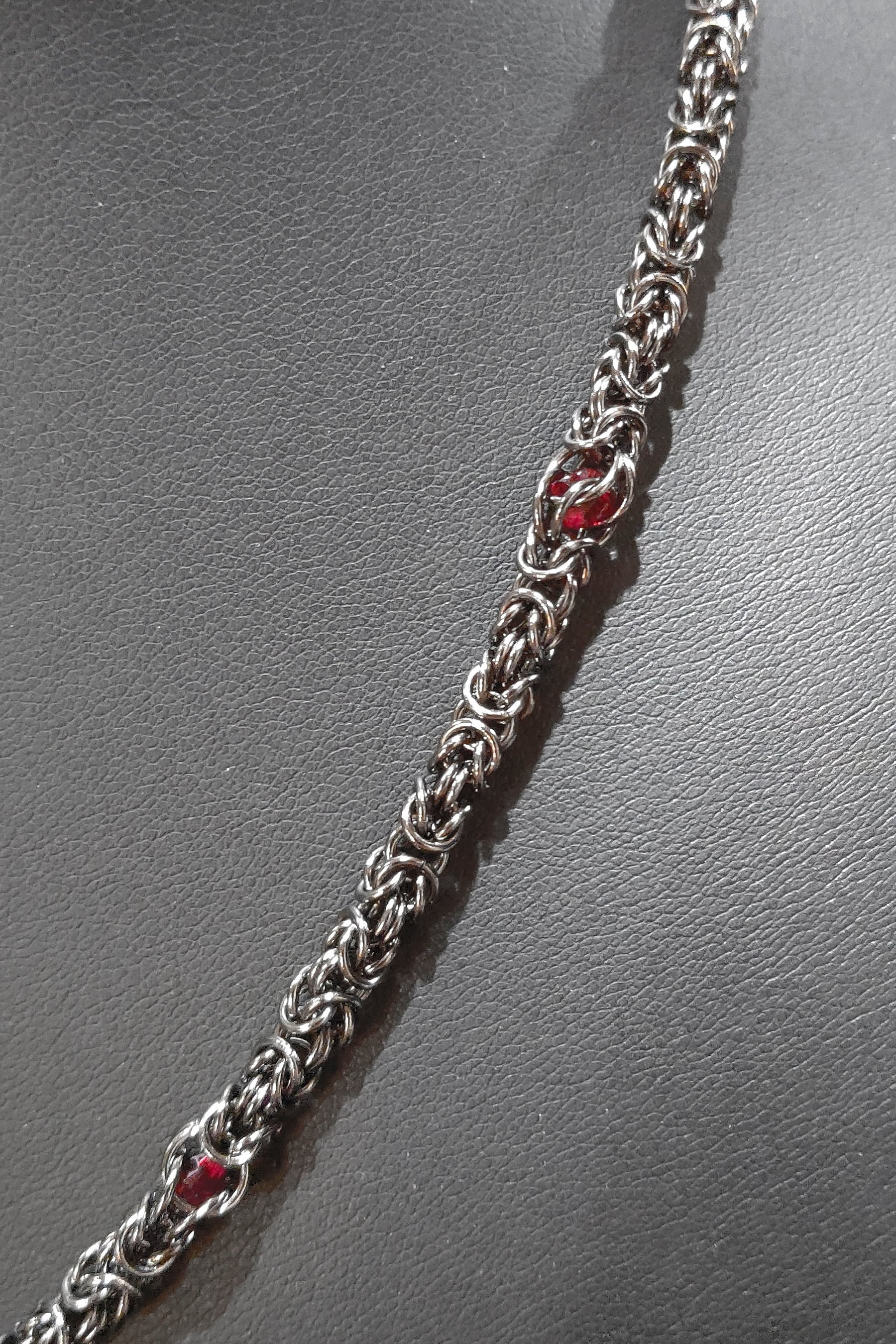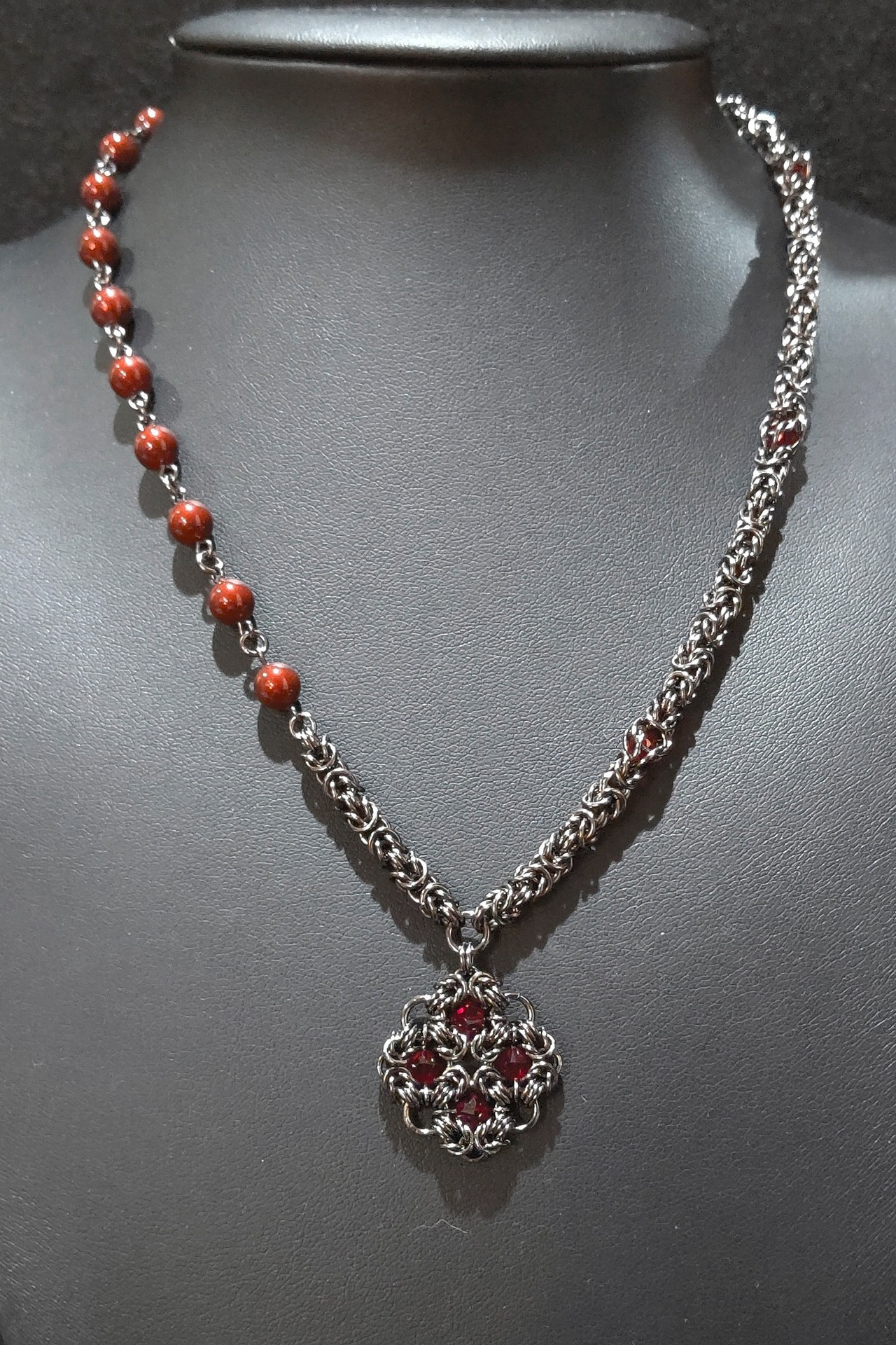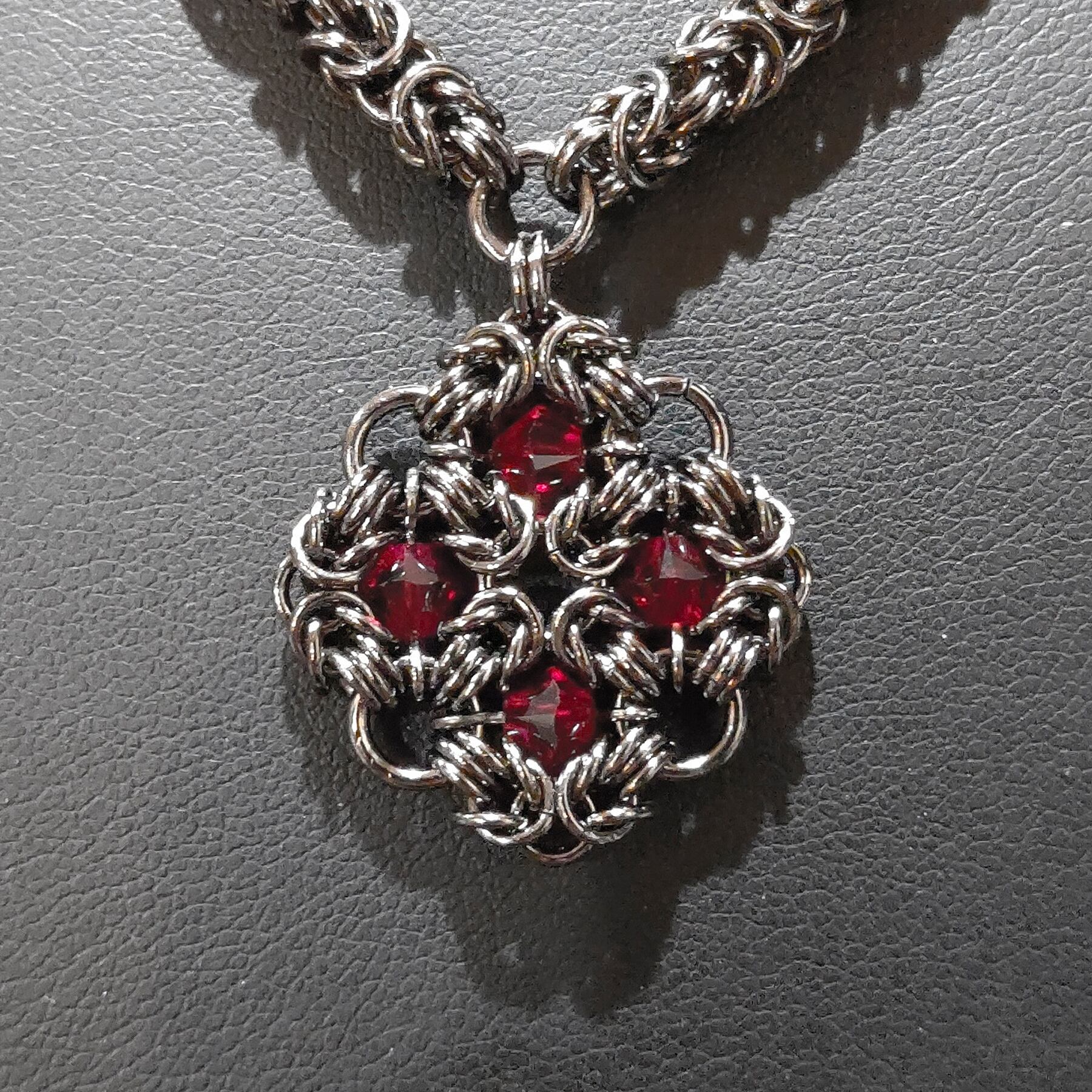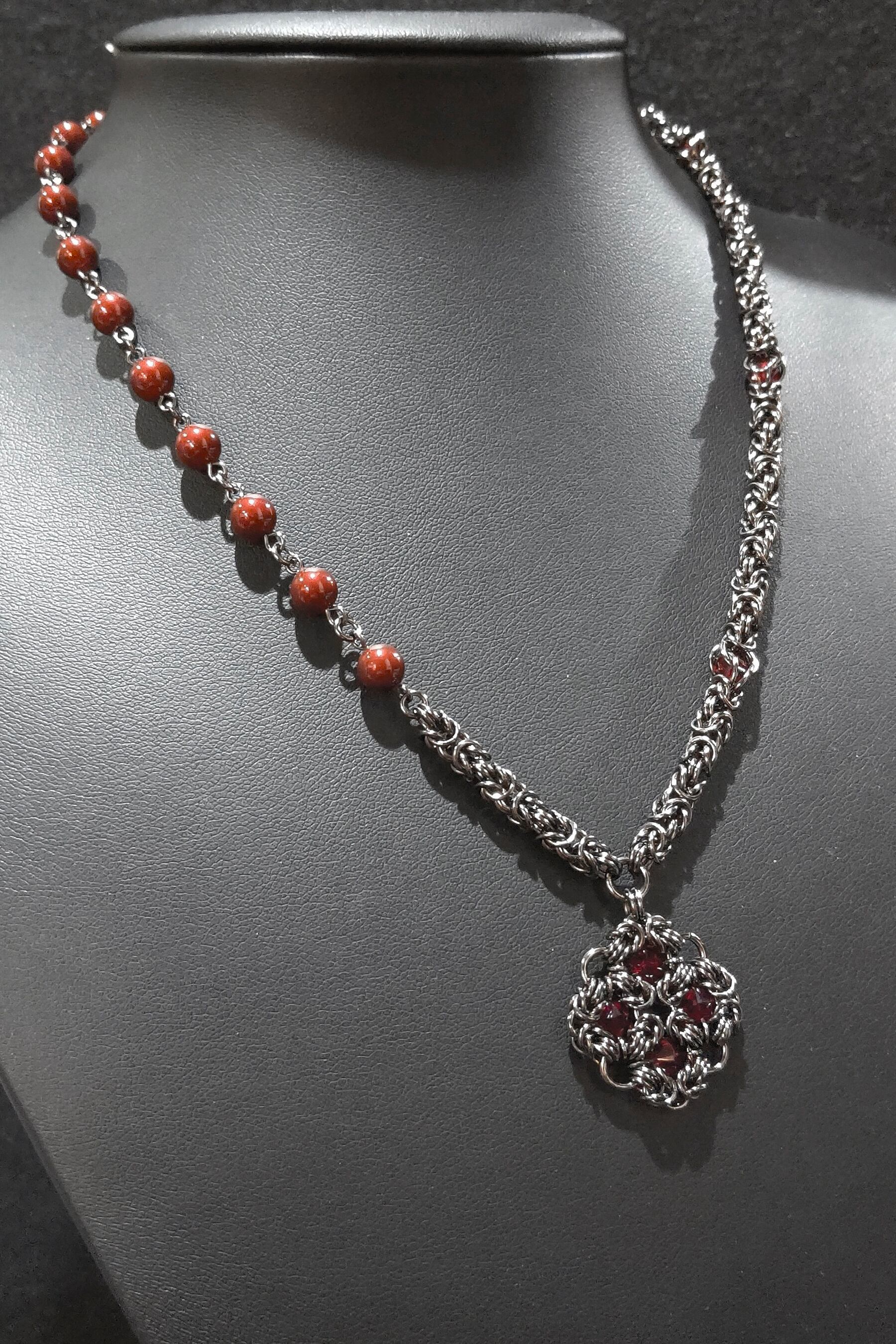 ネックレス部分は片側をビザンチンメイルにスワロフスキークリスタルを閉じ込めたサイバーメイル、もう片側はビザンチンメイルを少しとスワロフスキークリスタルパールで製作したアシンメトリーデザインです!