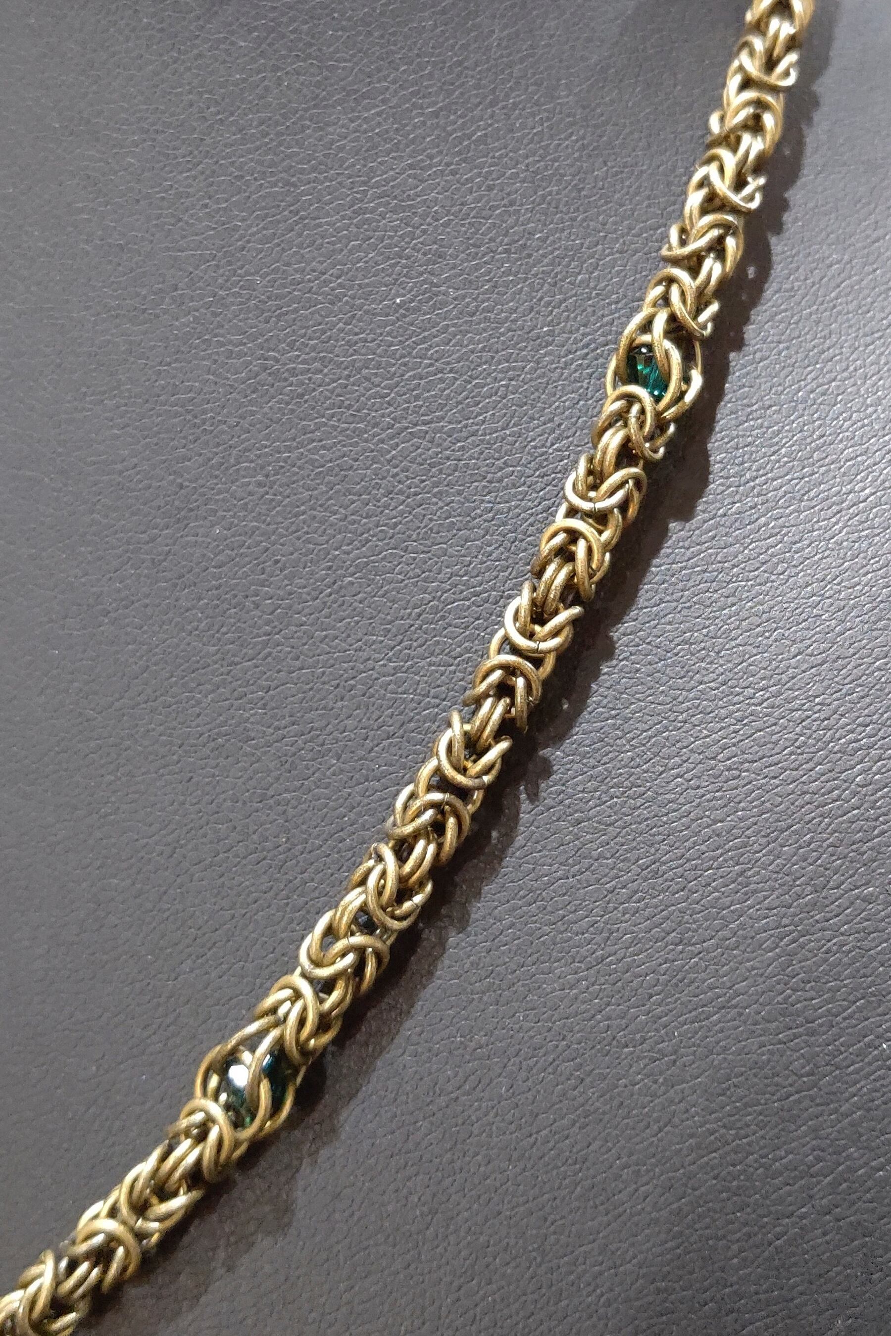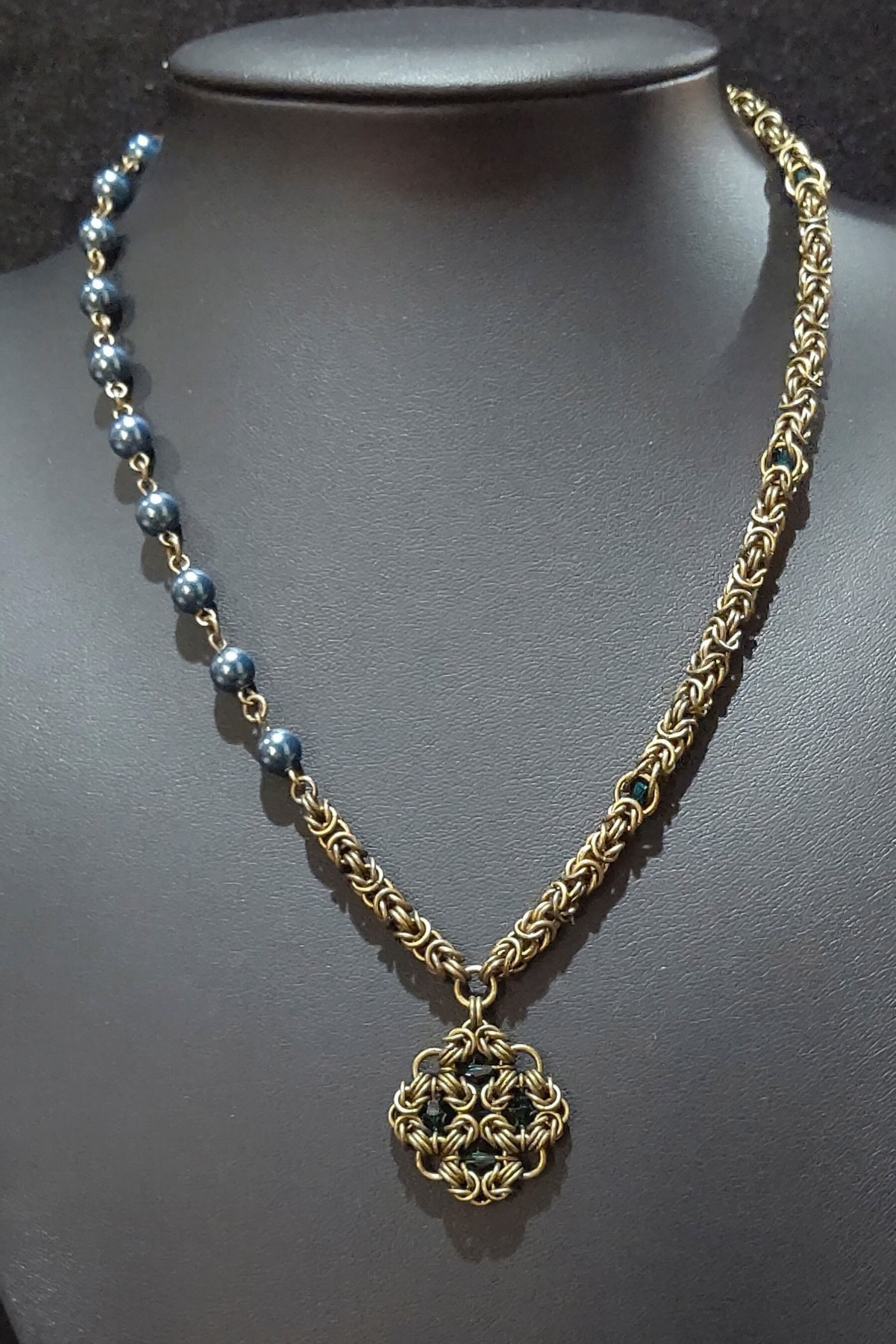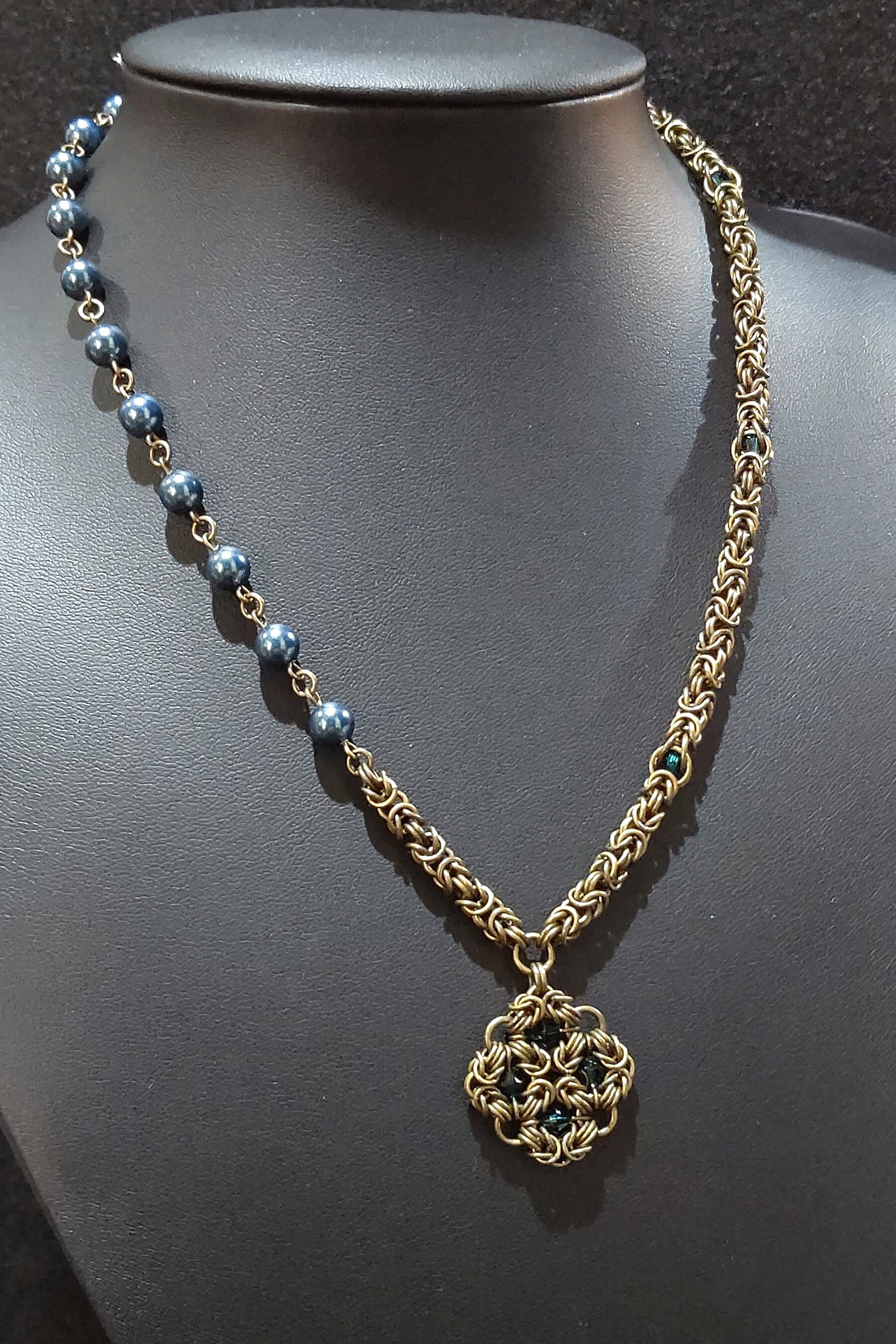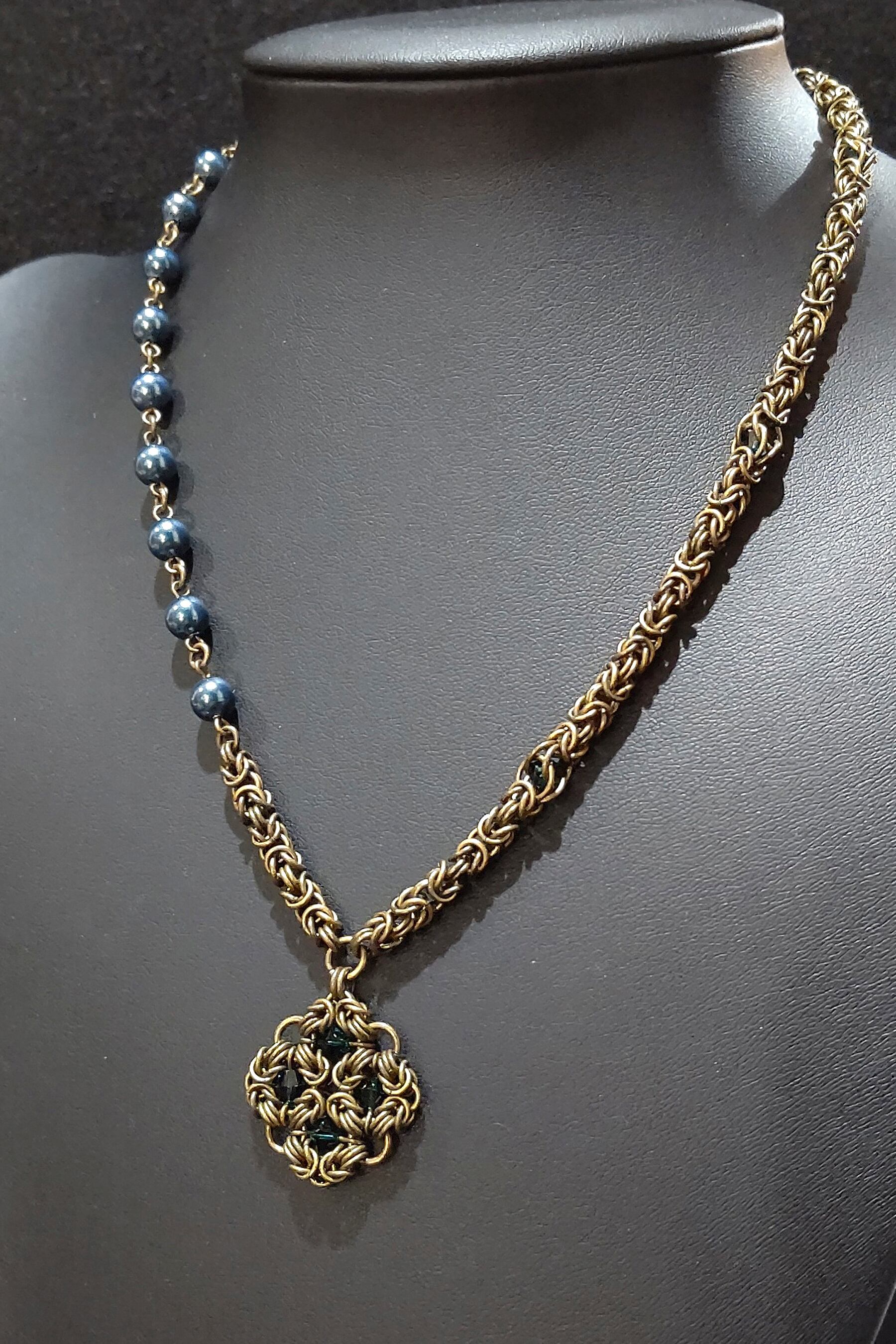 ネックレス部分は片側をビザンチンメイルにスワロフスキークリスタルを閉じ込めたサイバーメイル、もう片側はビザンチンメイルを少しとスワロフスキークリスタルパールで製作したアシンメトリーデザインです!