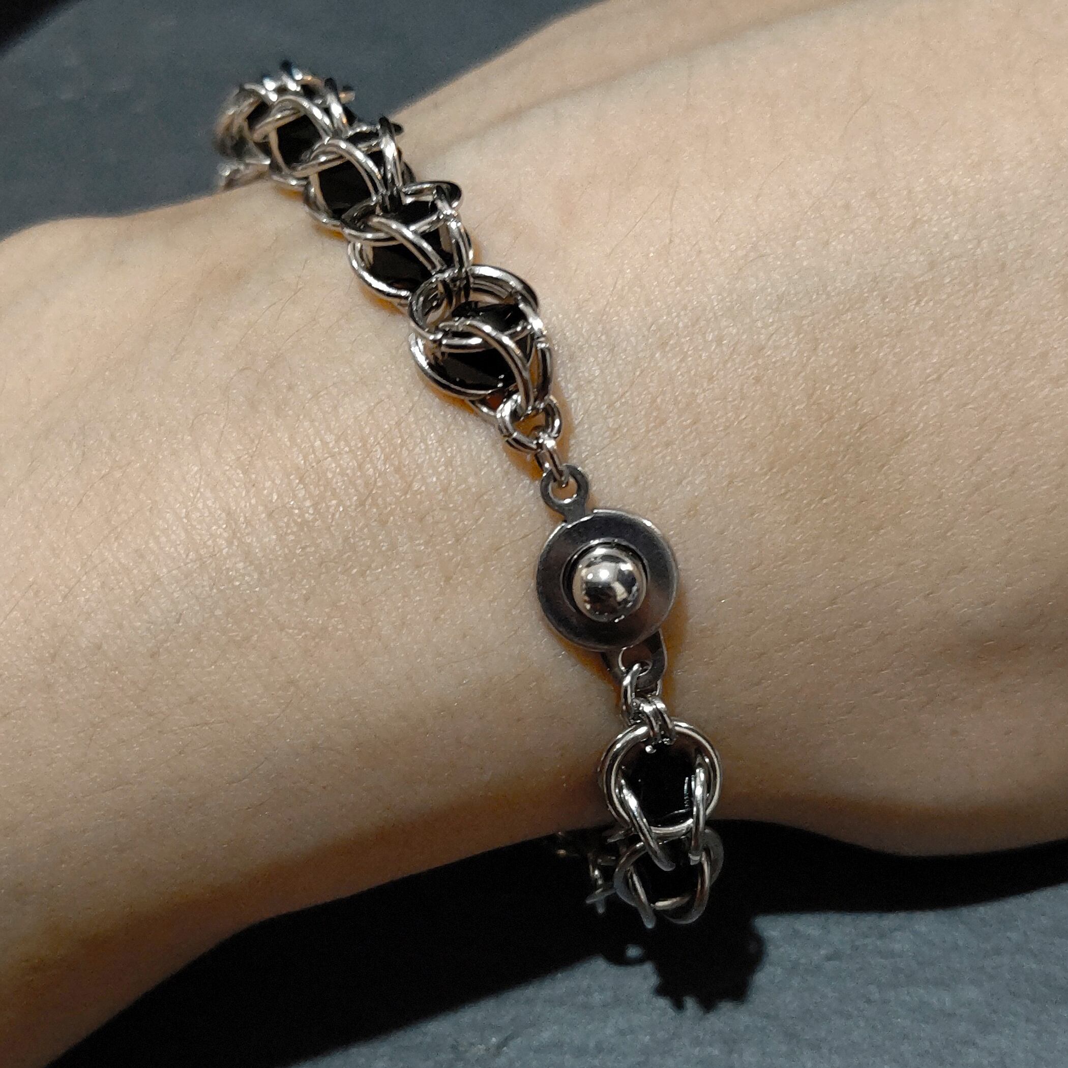 丸カンでビーズを閉じ込めた当店一番人気のサイバーメイルブレスレットに金属アレルギー対応タイプが新たに加わりました!